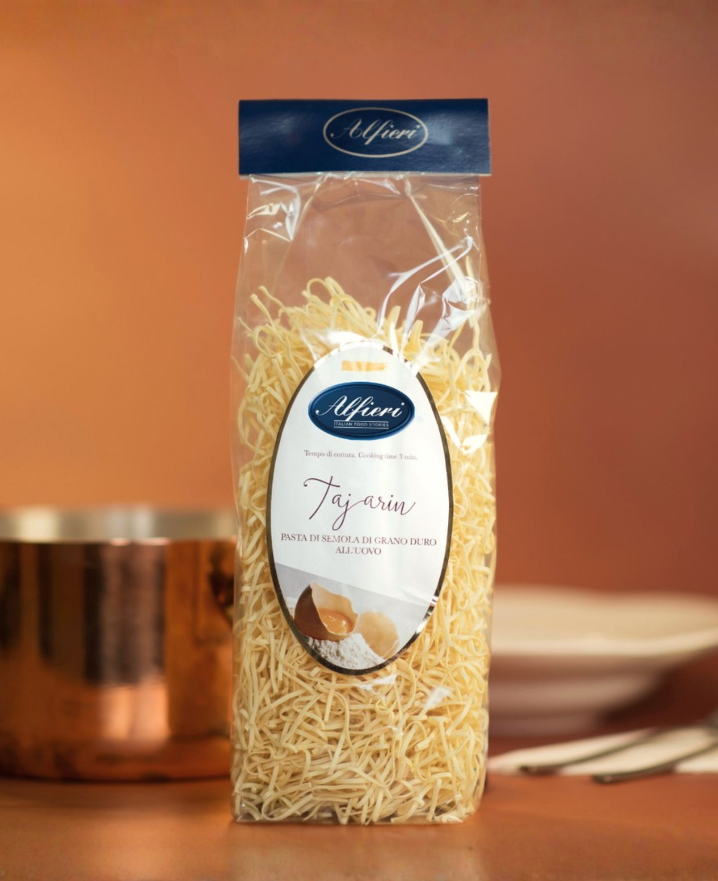 ALFIERI Tajarin – tai tradiciniai Pjemonto regiono kiaušinių makaronai, gaminami pagal autentišką itališką receptą. Šie ploni, švelnios tekstūros tajarin puikiai tinka elegantiškoms vakarienėms ir greitai paruošiamiems patiekalams – nuo sviesto bei šalavijų iki trumų sviesto ar sultinio pagrindo padažų.