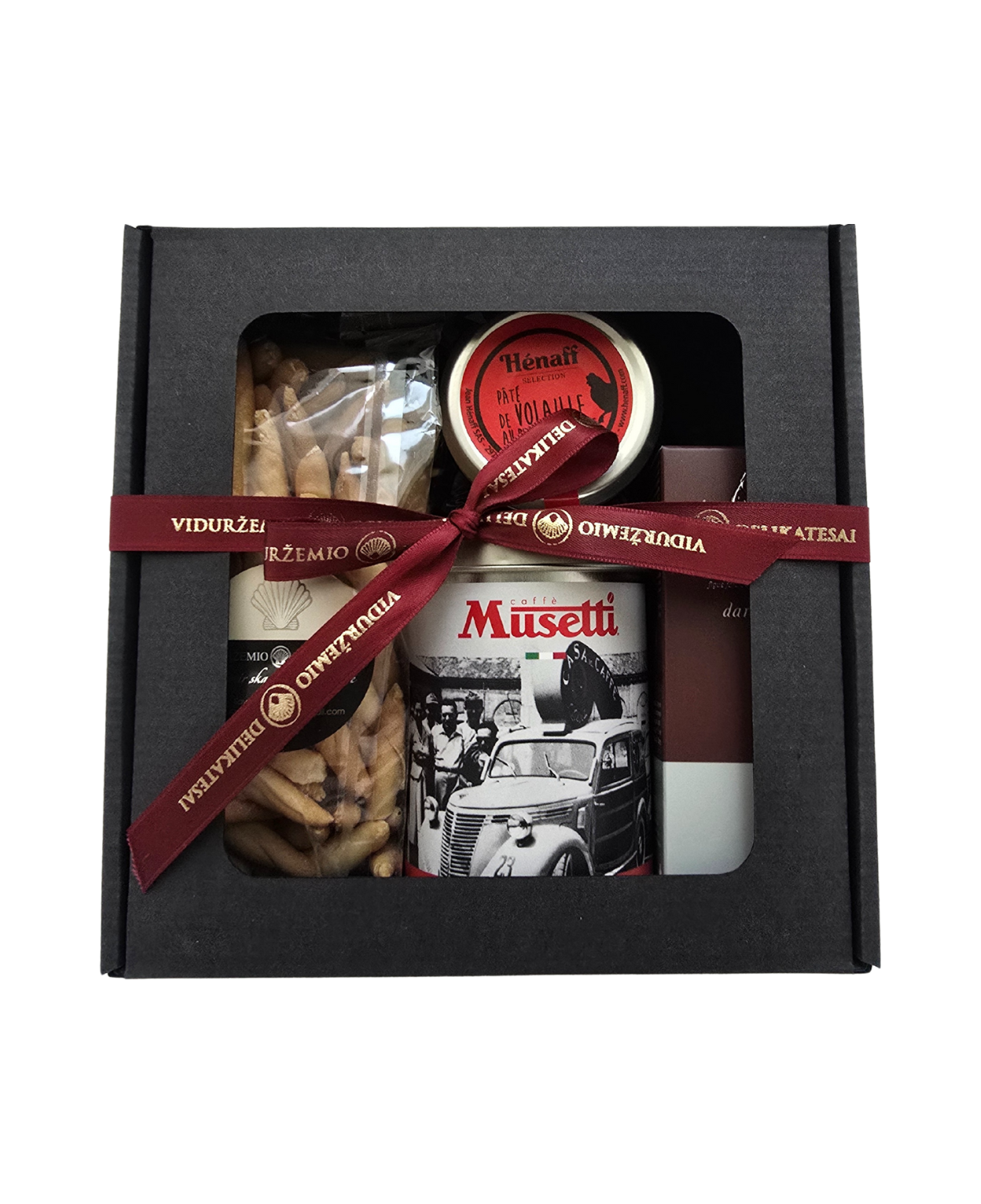 Visi produktai pateikiami elegantiškoje dėžutėje su langeliu ir kaspinėliu – puiki dovana verslo partneriui, kolegai ar artimam žmogui.