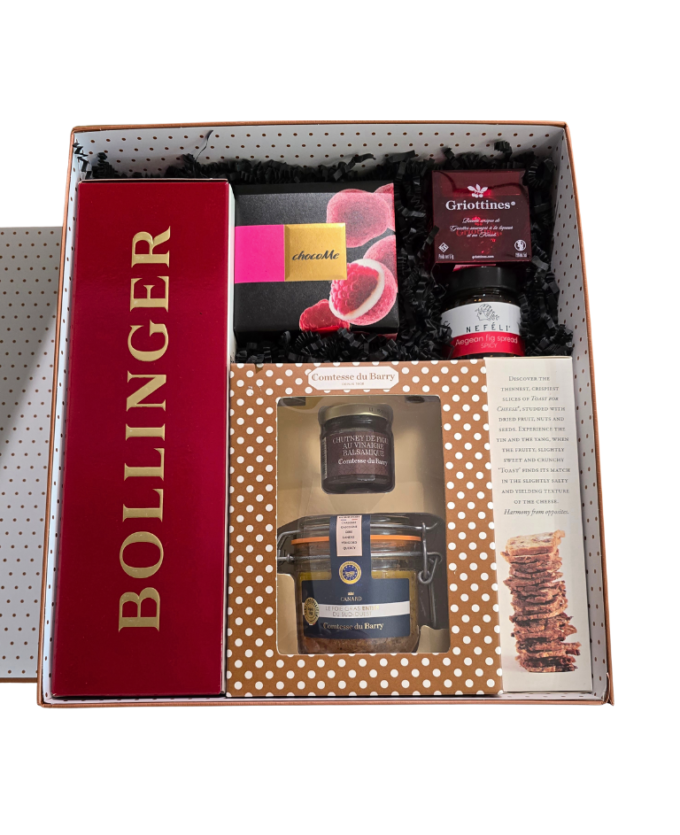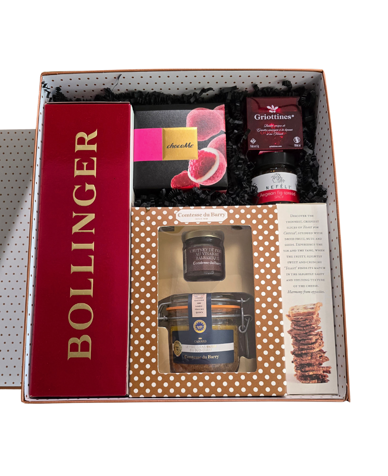 Gurmaniška „Comtesse du Barry“ dovanų dėžutė su prancūzišku šampanu „Bollinger“, foie gras, figų čatniu, vyšniomis, skrebučiais, džemu ir šokoladu – tai išskirtinė delikatesų kolekcija iš įvairių Europos šalių.